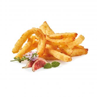 Crispy Rösti sticks in rustic handmade style. Made from fresh potato shavings with coloured pepper and a light onion note. Perfect for use as a snack item or as a modern side dish.
